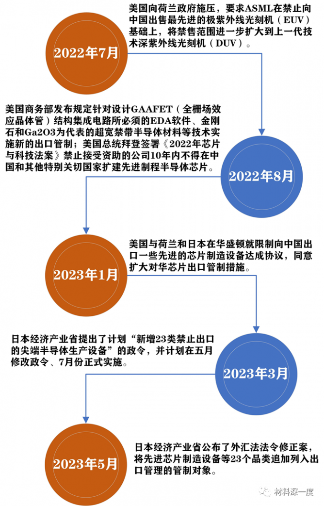 從2022年7月份開始,美國(guó)就聯(lián)合荷蘭對(duì)華實(shí)施了半導(dǎo)體設(shè)備出口管制措施,并多次施壓日本、荷蘭等在半導(dǎo)體設(shè)備領(lǐng)域具有優(yōu)勢(shì)地位的國(guó)家緊跟其腳步,形成美日荷半導(dǎo)體同盟限制中國(guó)半導(dǎo)體發(fā)展,試圖通過出口管制阻斷中國(guó)在尖端半導(dǎo)體領(lǐng)域的技術(shù)發(fā)展進(jìn)程。2023年3月日本順應(yīng)美國(guó)政府加強(qiáng)對(duì)抗中國(guó)半導(dǎo)體產(chǎn)業(yè)發(fā)展,從嚴(yán)對(duì)外出口尖端半導(dǎo)設(shè)備的管制。