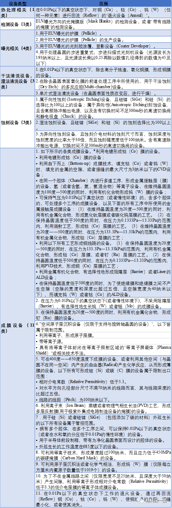 本次受限制的設(shè)備包括:清洗設(shè)備、薄膜沉積設(shè)備、熱處理設(shè)備、光刻/曝光設(shè)備、刻蝕設(shè)備、測(cè)試設(shè)備六個(gè)方面,涉及到材料生長(zhǎng)、清洗、成膜、光刻、刻蝕、摻雜、外延、檢測(cè)等重要工序,對(duì)國(guó)內(nèi)先進(jìn)制程的半導(dǎo)體產(chǎn)業(yè)會(huì)造成一定影響。