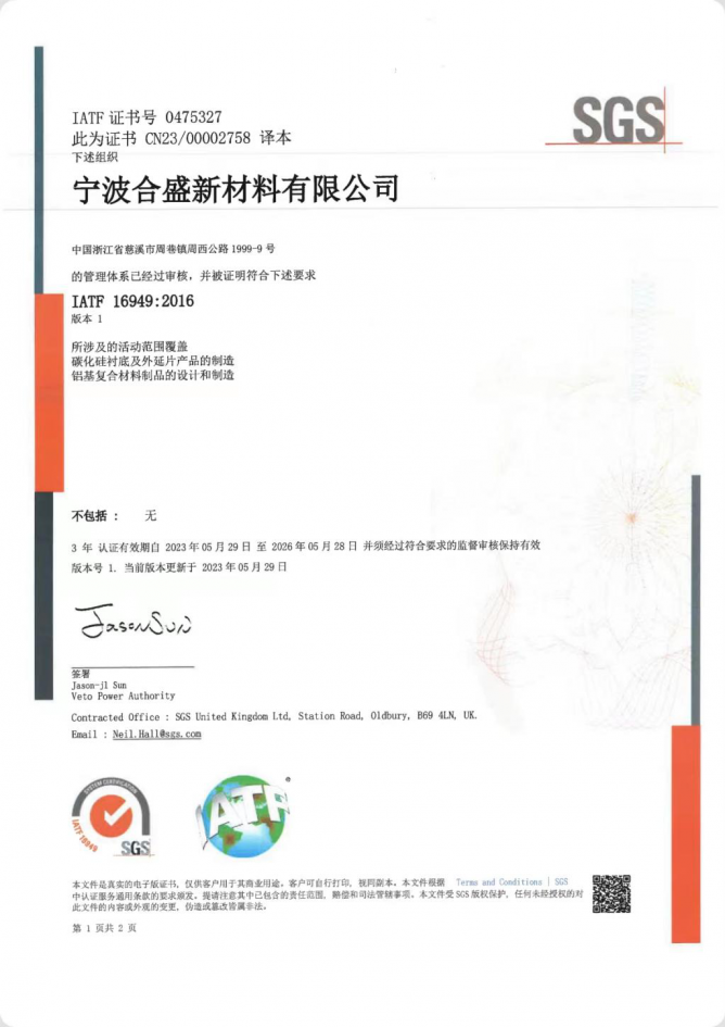 近日,合盛硅業(yè)控股子公司寧波合盛新材料有限公司順利通過(guò)IATF 16949:2016國(guó)際汽車(chē)行業(yè)質(zhì)量管理體系認(rèn)證,標(biāo)志著合盛硅業(yè)在要求極為嚴(yán)苛的全球汽車(chē)零部件市場(chǎng)取得了權(quán)威認(rèn)可和準(zhǔn)入資質(zhì)。本次認(rèn)證覆蓋碳化硅(SiC)襯底及外延片產(chǎn)品、鋁基復(fù)合材料制品等,對(duì)公司產(chǎn)品在汽車(chē)行業(yè)的市場(chǎng)競(jìng)爭(zhēng)力方面起到積極作用。