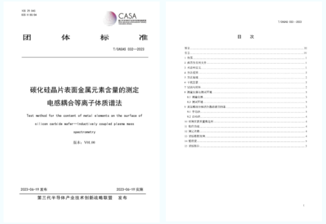 T/CASAS 032—2023《碳化硅晶片表面金屬元素含量的測定電感耦合等離子體質(zhì)譜法》描述了電感耦合等離子體質(zhì)譜法測定碳化硅晶片表面金屬元素含量的方法。適用于碳化硅單晶拋光片和碳化硅外延片表面痕量金屬鈉、鋁、鉀、鈣、鈧、鈦、釩、鉻、錳、鐵、鈷、鎳、銅、鋅、銀、鎢、金、汞等元素含量的測定,測定范圍為108 cm-2~1012 cm-2。適用于100 mm(4吋)~200 mm(8吋)碳化硅原生晶片、碳化硅退火片等無圖形碳化硅晶片表面痕量金屬元素含量的測定。