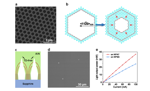 圖a:六方孔洞結(jié)構(gòu)NPAT的SEM圖像,圖b:NPAT上AlN側(cè)向外延精細(xì)調(diào)控示意圖,圖c:NPAT上AlN側(cè)向外延降低位錯(cuò)密度的原理示意圖,圖d:NPAT上AlN外延層腐蝕坑的SEM圖像,圖e:基于NPAT上AlN襯底的深紫外發(fā)光二極管光輸出功率隨注入電流的變化曲線及與常規(guī)圖形化藍(lán)寶石襯底上器件性能的對(duì)比。