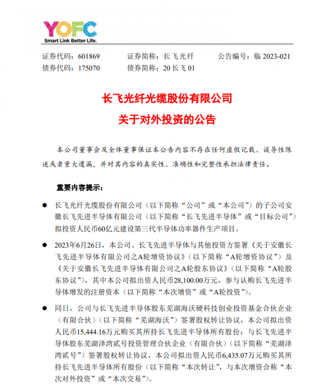 6月26日,長(zhǎng)飛光纖發(fā)布《關(guān)于對(duì)外投資的公告》,子公司安徽長(zhǎng)飛先進(jìn)半導(dǎo)體有限公司擬投資人民幣60億元建設(shè)第三代半導(dǎo)體功率器件生產(chǎn)項(xiàng)目。