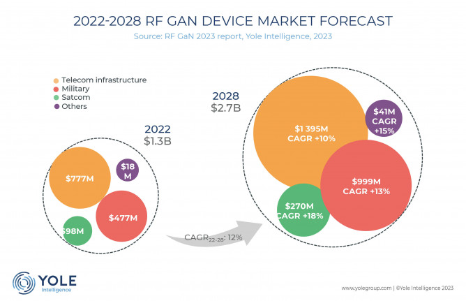 Yole group近期發(fā)布了關于射頻氮化鎵器件市場的調查研究。報告顯示,2022年射頻氮化鎵器件市場價值13億美元,預計到2028年將達到27億美元,2022年至2028年復合年增長率為12% ;SEDI(住友電工)、Qorvo和Wolfspeed:前三名設備廠商穩(wěn)步增長,恩智浦電信業(yè)務創(chuàng)造高收入;電信領域新機遇為射頻硅基氮化鎵打開大門。