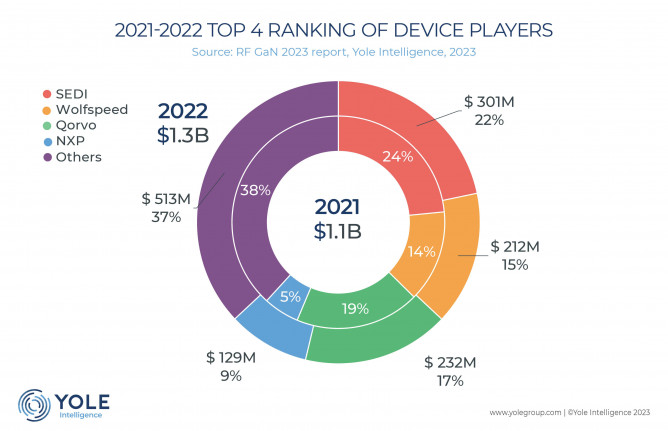 2022年,SEDI、Qorvo和Wolfspeed是射頻氮化鎵器件業(yè)務的主要參與者,而恩智浦在進入電信市場供應鏈后增長顯著。三大供應商Wolfspeed、Coherent和 SICC仍然占據(jù)著碳化硅市場。在國防領域,雷神、諾斯洛普·格魯門公司和中國電子科技集團正引領采用氮化鎵。美國國防部信任的Wolfspeed和Qorvo也是氮化鎵代工廠。愛立信和諾基亞關注電信市場供應商,繼續(xù)開發(fā)射頻氮化鎵器件的供應,以從多個供應商處采購,而三星則與韓國設備制造商進行密切合作。自美國制裁以來,華為和中興已轉向中國供應鏈,發(fā)展國內能力。