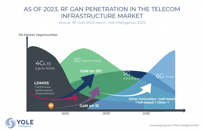 Poshun Chiu, Yole集團旗下Yole Intelligence公司專門研究復合半導體和新興襯底的高級技術和市場分析師表示,“到2023年,主流氮化鎵技術應用在碳化硅襯底上。該技術已經成熟,并在高功率和高頻率下表現(xiàn)出良好的性能。過去幾年里,像意法半導體與MACOM、Ommic、英飛凌等這樣的廠商以及格芯和聯(lián)電等代工廠一直致力于引入射頻硅基氮化鎵技術。由于電信小蜂窩需要較低功耗的PA,硅基氮化鎵可以在10W以下的32T32R和64T64R mMIMO基站中找到最佳位置。預計硅基氮化鎵將從2023年底開始進入市場,并在未來幾年占據(jù)市場份額。”