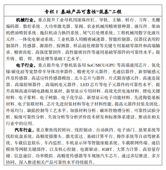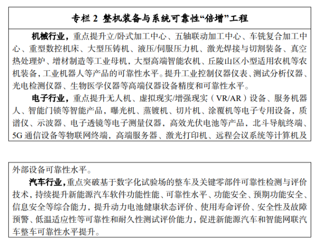 此外,《制造業(yè)可靠性提升實(shí)施意見(jiàn)》解讀指出,機(jī)械、電子、汽車三個(gè)行業(yè)產(chǎn)業(yè)規(guī)模大,占工業(yè)總產(chǎn)值比重高,輻射帶動(dòng)能力強(qiáng),且具備一定的可靠性工作基礎(chǔ),在制造業(yè)可靠性提升中具有代表性。機(jī)械行業(yè)是國(guó)民經(jīng)濟(jì)的支柱產(chǎn)業(yè),已具備相當(dāng)規(guī)模,部分產(chǎn)品可靠性水平提升明顯;電子是工業(yè)基礎(chǔ)行業(yè),行業(yè)體量大、市場(chǎng)競(jìng)爭(zhēng)充分,對(duì)其他行業(yè)具有重要支撐作用,重點(diǎn)企業(yè)均已建立完善的可靠性管理體系;汽車的安全可靠與人民群眾生命財(cái)產(chǎn)息息相關(guān),行業(yè)可靠性實(shí)踐起步早、步伐快、水平高,已形成較為完善的可靠性技術(shù)和管理體系?!秾?shí)施意見(jiàn)》聚焦機(jī)械、電子、汽車三個(gè)重點(diǎn)行業(yè),一方面,通過(guò)提高核心基礎(chǔ)零部件、核心基礎(chǔ)元器件可靠性,促進(jìn)相關(guān)行業(yè)產(chǎn)品可靠性提升,增強(qiáng)產(chǎn)業(yè)鏈供應(yīng)鏈韌性。另一方面,發(fā)揮行業(yè)基礎(chǔ)優(yōu)勢(shì),形成可復(fù)制可推廣的先進(jìn)經(jīng)驗(yàn),為其他行業(yè)樹立典型示范,帶動(dòng)制造業(yè)可靠性整體水平提升。