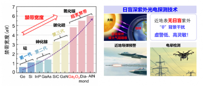 圖1. 半導(dǎo)體材料的發(fā)展歷程(左圖)和日盲深紫外光電探測(cè)技術(shù)(右圖)。