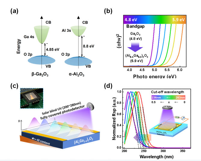 圖2. (a-b) (AlxGa1-x)2O3合金薄膜的帶隙演變;(c-d) (AlxGa1-x)2O3合金薄膜光電探測(cè)器對(duì)日盲波段的有效覆蓋。