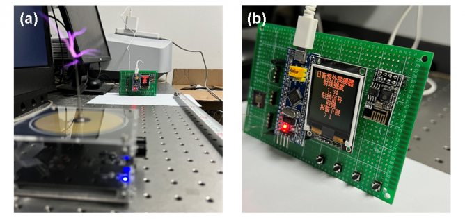 近期,廈門大學(xué)張洪良課題組聯(lián)合上海光機(jī)所齊紅基、陳端陽(yáng)團(tuán)隊(duì),采用(AlxGa1-x)2O3合金化能帶工程,實(shí)現(xiàn)了禁帶寬度從4.8 eV到6 eV大范圍調(diào)控,并在此基礎(chǔ)上完成了對(duì)日盲紫外區(qū)全波段覆蓋的日盲光電探測(cè)器的開發(fā)(圖2)。該系列的日盲紫外探測(cè)器檢測(cè)截止波長(zhǎng)可以從263 nm調(diào)節(jié)到236 nm,響應(yīng)峰從238 nm調(diào)節(jié)到209 nm,且具有優(yōu)異的比探測(cè)率(高達(dá)1015 Jones),較大的紫外可見抑制比(≈ 105),以及良好的長(zhǎng)時(shí)間運(yùn)行穩(wěn)定性。同時(shí),該團(tuán)隊(duì)開發(fā)了具備數(shù)字接口的日盲紫外探測(cè)器測(cè)試模塊,實(shí)現(xiàn)對(duì)人造電弧的實(shí)時(shí)靈敏監(jiān)測(cè)(圖3)。全日盲紫外波段檢測(cè)技術(shù)能廣泛應(yīng)用在如天文學(xué)、地球氣象學(xué)、材料科學(xué)、環(huán)境科學(xué)等各個(gè)領(lǐng)域,通過高精度地繪制日盲光區(qū)的光譜特征,為這些領(lǐng)域的監(jiān)測(cè)對(duì)象提供了更加全面、精細(xì)的物質(zhì)結(jié)構(gòu)和化學(xué)組成信息。