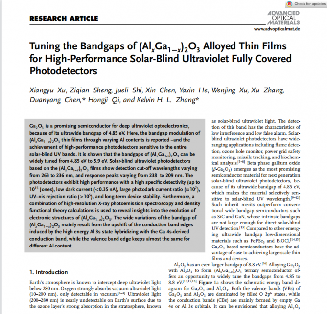本研究工作為開發(fā)高靈敏多光譜的日盲紫外光電探測(cè)器,以及(AlxGa1-x)2O3能帶調(diào)控和界面異質(zhì)結(jié)二維電子氣提供了重要的研究基礎(chǔ)。相關(guān)工作以“Tuning the Bandgaps of (AlxGa1-x)2O3 Alloyed Thin Films for High-Performance Solar-Blind Ultraviolet Fully Covered Photodetectors”為題發(fā)表在國(guó)際著名期刊Advanced Optical Materials上,廈門大學(xué)博士研究生徐翔宇為論文第一作者。本工作得到了國(guó)家重點(diǎn)研發(fā)計(jì)劃項(xiàng)目和深圳市基礎(chǔ)研究專項(xiàng)的資助和支持。