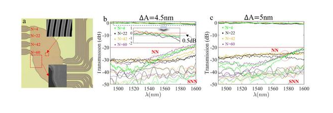 同時(shí),課題組基于該原理設(shè)計(jì)了硅基半波長(zhǎng)芯間距的密集波導(dǎo)陣列。通過(guò)對(duì)波導(dǎo)軌跡進(jìn)行調(diào)制,引入人工規(guī)范場(chǎng),來(lái)抑制波導(dǎo)陣列間的強(qiáng)烈串?dāng)_。實(shí)驗(yàn)結(jié)果表明,在由64根半波長(zhǎng)芯間距波導(dǎo)組成的陣列中,實(shí)現(xiàn)了具有70nm帶寬的-30dB的串?dāng)_抑制和大于100nm的-25dB的串?dāng)_抑制,以及可忽略不計(jì)的插入損耗。該設(shè)計(jì)可以在片上實(shí)現(xiàn)靈活的路由,并將現(xiàn)有的波導(dǎo)集成度提升了3倍以上。