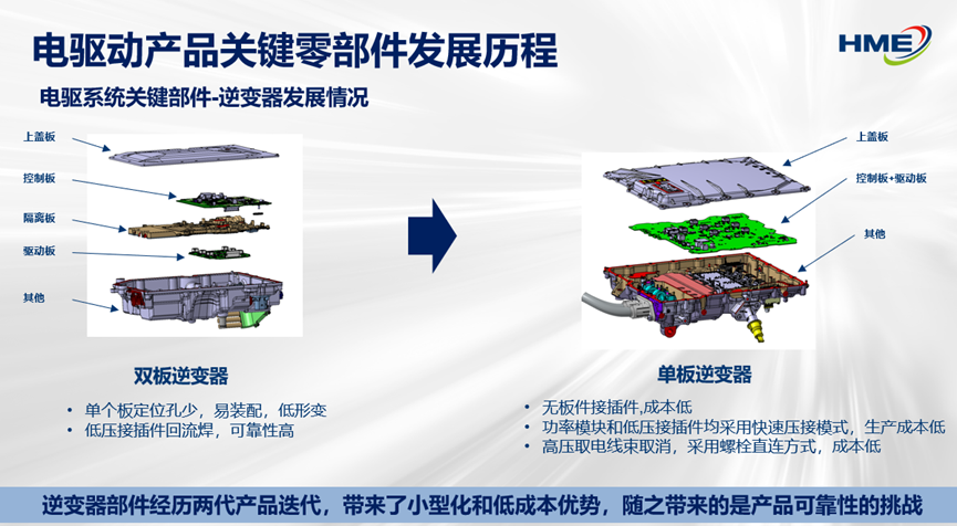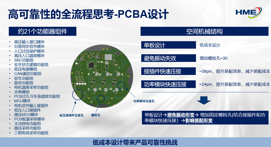我們電驅(qū)動系統(tǒng)關(guān)鍵部件為了適應(yīng)市場需求,我們經(jīng)過了兩代的更迭,核心特點,第一代是雙板的逆變器,到了最新一代是單板逆變器,帶來的好處就是小型化、低成本。但這樣的變更也帶來了產(chǎn)品可靠性的挑戰(zhàn)。今天我以PCBA這個關(guān)鍵部件為例,從設(shè)計-仿真-測試-最終量產(chǎn),怎樣保證全流程的可靠性。