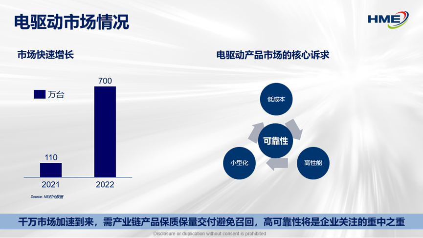 電驅(qū)動市場是快速增長的一個市場,從2021年110萬輛到2022年700萬輛。因此,得出的結(jié)論就是千萬級的市場會很快到來。