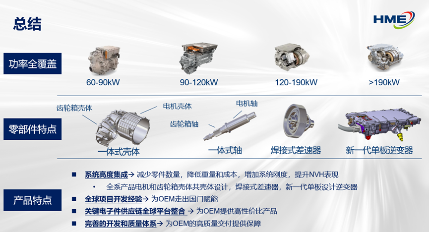 總結(jié)來說,我們是功率全覆蓋。零部件我們是一體式殼體,從產(chǎn)品一投放市場我們就是采用這樣的技術(shù),一體式軸,還有焊接式差速器,最后是新一代單板逆變器。最終形成了我們四個產(chǎn)品特點:第一,系統(tǒng)高度集成,減少零件數(shù)量、降低成本。第二,我們作為合資公司,現(xiàn)在有兩個global項目的量產(chǎn)開發(fā)經(jīng)驗,所以我們會為OEM走出國門賦能。第三, 高性價比產(chǎn)品 。我們是采用關(guān)鍵電子零部件全球平臺整合,依托股東方的資源進行全球采購,拿到比較高性價比的產(chǎn)品價格。最后是完善的開發(fā)和質(zhì)量體系,為OEM高質(zhì)量交付提供保障。