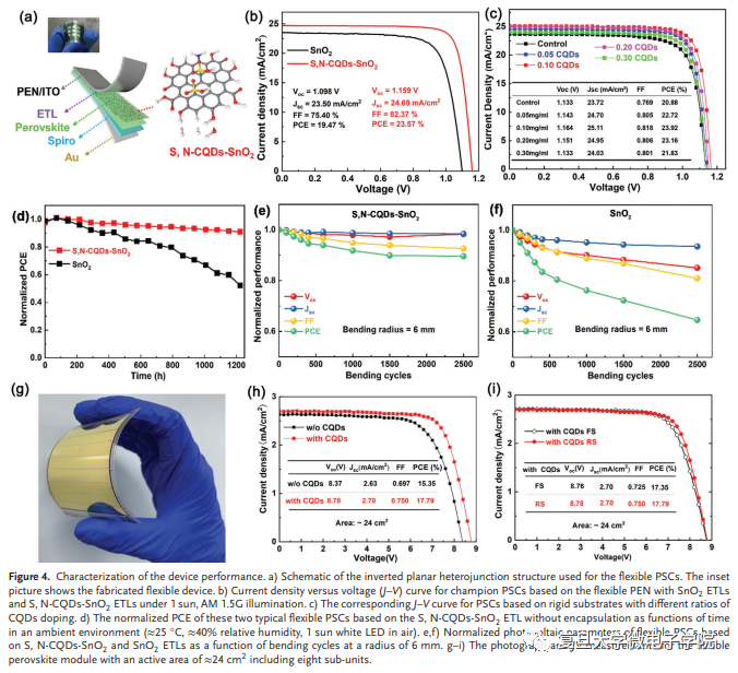 特別是在碳基量子點(CQD)增強SnO2電子遷移率的驅(qū)動力及機制方面,楊迎國聯(lián)合西安交通大學(xué)董化、東南大學(xué)盧海洲、南京工業(yè)大學(xué)秦天石&黃維等在《Advanced Energy Materials》(AEM,JCR Q1區(qū),影響因子~27.8)刊發(fā)活性SnO2晶面使高效和超可彎曲的正式鈣鈦礦太陽能電池具有創(chuàng)紀(jì)錄的功率轉(zhuǎn)換效率的研究成果:Active SnO2 Crystal Planes Enable Efficient and Ultra-Bendable n-i-p Perovskite Solar Cells with Record Certificated Power Conversion Efficiency,DOI:https://doi.org/10.1002/aenm.202300661。首次采用高角度環(huán)形暗場掃描透射電子顯微鏡(HAADF-STEM)揭示了一種新型碳量子點摻雜后SnO2晶面的變化;基于同步輻射紅外光譜得到了碳量子點修飾的SnO2的相關(guān)物化性質(zhì)及反應(yīng)機理;基于同步輻射掠入射廣角X射線散射(GIWAXS)可以穿透柔性基板以檢測鈣鈦礦層的掩埋區(qū)域,發(fā)現(xiàn)碳量子點修飾的SnO2顯著提高了鈣鈦礦的結(jié)晶度和相純度等相關(guān)機制。如圖1示,柔性正式鈣鈦礦太陽能電池的功率轉(zhuǎn)換效率高達23.57%(22.75%,經(jīng)認證),這是單結(jié)正式柔性鈣鈦礦太陽能電池的最高值之一。相應(yīng)的正式柔性模組實現(xiàn)了17.79%的效率,孔徑面積約為24cm2。此外,柔性鈣鈦礦太陽能電池表現(xiàn)出出色的穩(wěn)定性,在40%的相對濕度和25°C的1個太陽光照射下1200小時后保持約95%的初始效率,并在2500次彎曲循環(huán)后保持>90%的初始效率,彎曲半徑為6毫米。