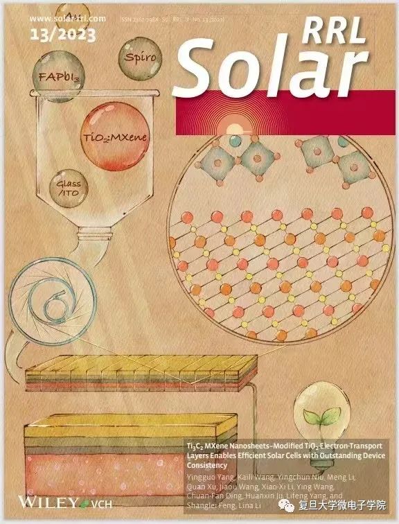 針對光電器件大面積制備、工作機理等研究方面,楊迎國聯(lián)合上海光源團隊等在《Solar RRL》(JCR Q1區(qū),影響因子~7.9)報道了基于FAPbI3的鈣鈦礦太陽能電池(PSC),通過MXene(Ti3C2)改性TiO2實現(xiàn)了高達24.63%的光電轉(zhuǎn)換效率。首次采用同步輻射掠入射廣角X射線散射技術(shù)大規(guī)模探測了完整的光電器件的結(jié)構(gòu)和性能均一性及機制,為表征大尺寸高效、穩(wěn)定、可靠的光電器件模組提供了新的可能。這一工作入選該期刊7月份第1期期刊前封面(圖2:Ti3C2 MXene Nanosheets–Modified TiO2 Electron-Transport Layers Enables Efficient Solar Cells with Outstanding Device Consistency,DOI:https://doi.org/10.1002/solr.202300153。
