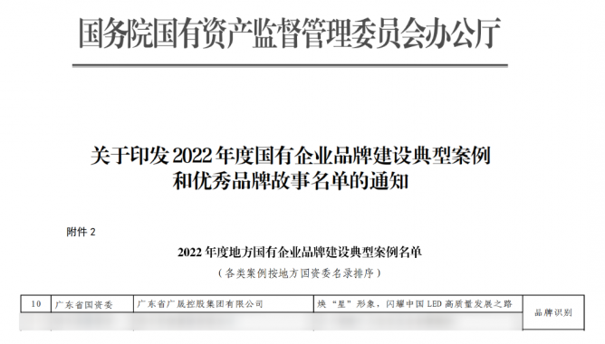 近日,國務院國資委評選出2022年度國有企業(yè)100個品牌建設典型案例和100個優(yōu)秀品牌故事。廣晟集團控股上市公司國星光電品牌案例《煥“星”形象,閃耀中國LED高質量發(fā)展之路》成功入選2022年度地方國有企業(yè)品牌建設典型案例名單。