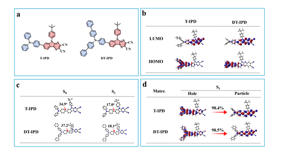 圖1 新開發(fā)材料開發(fā)的分子T-IPD和DT-IPD的化學(xué)結(jié)構(gòu)及前線軌道和自然躍遷軌道分布示意圖