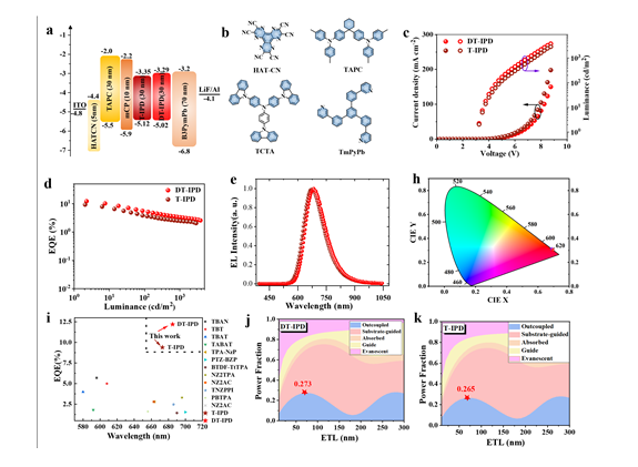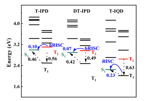 近日,中國(guó)科學(xué)院寧波材料技術(shù)與工程研究所葛子義研究員和李偉副研究員以及華南理工大學(xué)蘇仕健教授等提出了一種新穎的分子設(shè)計(jì)策略,成功地將熱激子機(jī)制和AIE特性融合到單個(gè)分子中。在新開發(fā)的分子T-IPD和DT-IPD中(圖1),通過調(diào)節(jié)受體單元的共軛長(zhǎng)度,單重激發(fā)(S1)態(tài)的能量顯著提高至第二三重激發(fā)(T2)態(tài),從而極大增強(qiáng)了高能態(tài)的逆系間竄越過程(hRISC)(圖2)。通過引入TPA和DP-TPA給體基團(tuán),T-IPD和DT-IPD可以形成剛性和扭曲的三維幾何結(jié)構(gòu),具有適當(dāng)?shù)亩娼?,有效抑制了分子間π-π堆積和分子內(nèi)運(yùn)動(dòng),使其在固體或聚集態(tài)下呈現(xiàn)強(qiáng)烈的發(fā)光。同時(shí),它們的AIE特性可以通過在聚集態(tài)下形成J-聚集體結(jié)構(gòu)進(jìn)一步增強(qiáng)。由于熱激子機(jī)制和AIE特性,研究人員獲得了最高12.2%的外量子效率,這是基于熱激子機(jī)制和AIE特性的深紅色OLEDs中性能最高的(圖3)。