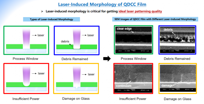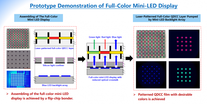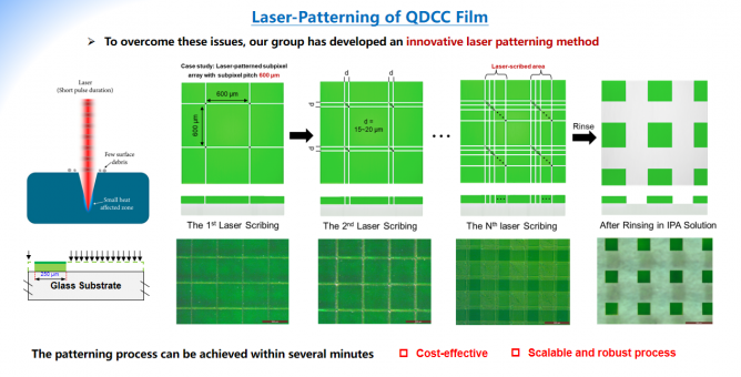 報(bào)告指出,香港科技大學(xué)團(tuán)隊(duì)首次用激光燒蝕的方法制作了圖形化量子點(diǎn)薄膜,并提出了一種切實(shí)可行的應(yīng)用在Mini/Micro-LED顯示設(shè)備的方案。研究結(jié)果驗(yàn)證了該方法高效,穩(wěn)定,顏色效果好,同時(shí)成本相對(duì)較低且適宜進(jìn)行量產(chǎn)。
