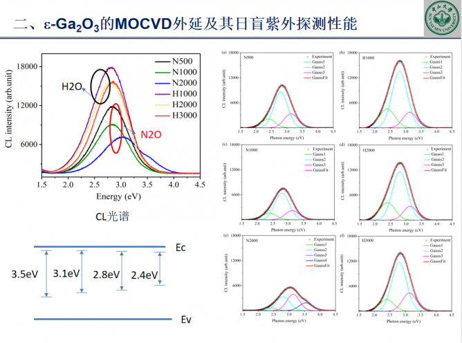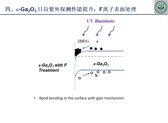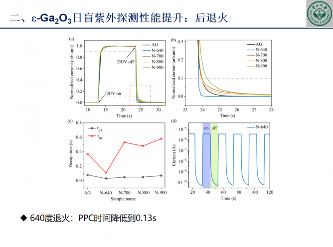 研究采用兩步法MOCVD外延了ε氧化鎵,并對比了H2O和N2O作為氧源對紫外探測性能的影響。XRD、AFM、CL等手段分析表明,H2O作為氧源可提高結(jié)晶質(zhì)量,降低缺陷密度,并獲得了光暗電流比(PDCR)為1.0×103,響應(yīng)上升時間0.55 s, 衰減時間為0.58 s/3.14s的紫外探測性能。700度以上高溫后退火,發(fā)生相轉(zhuǎn)變,探測器性能劣化。低溫退火可有效的消除氧空位等點缺陷,降低暗電流,改善光暗電流比和響應(yīng)時間特性。經(jīng)過640度退火的日盲紫外探測器,暗電流降低至0.069pA,拒絕比(Rpeak/R400)達(dá)到2.4×104, 光暗電流比達(dá)到3×105。F表面處理在表面引入二維電子氣,改善探測器歐姆接觸特性,同時表面的電子勢井,改善器件的響應(yīng)時間,顯著增加探測靈敏度和提高增益。