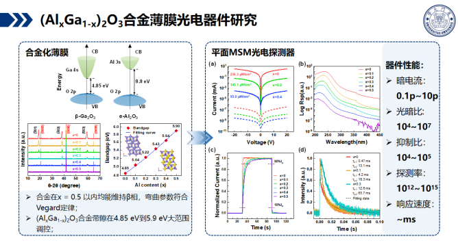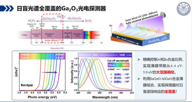 研究顯示,通過對外延薄膜后退火處理,獲得高響應(yīng)度、高探測率的日盲紫外光電探測器,實(shí)現(xiàn)對實(shí)際日盲信號的靈敏響應(yīng)。解釋了器件性能的大幅改善,是受到了由退火引起的缺陷以及表面狀態(tài)變化的共同影響。通過對Ga2O3進(jìn)行Al/In合金化,實(shí)現(xiàn)了大范圍的帶隙調(diào)控,制備出了能夠響應(yīng)全日盲波段的紫外光電探測器,并解釋了合金組分的引入對能帶結(jié)構(gòu)的影響。