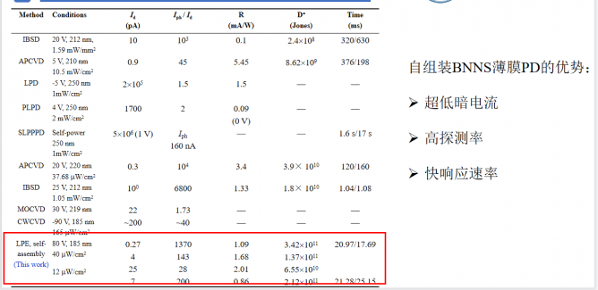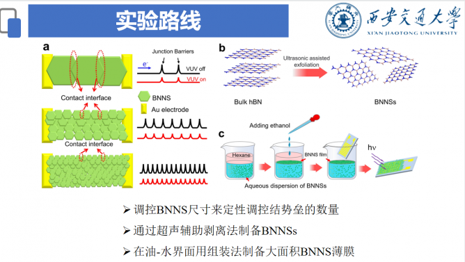 目前實(shí)驗(yàn)上已經(jīng)能輕松實(shí)現(xiàn)2英寸薄膜的制備。在這種薄膜中,由于每個(gè)BNNS均存在表面態(tài),在每個(gè)相鄰的BNNSs的接觸界面存在一個(gè)結(jié)勢(shì)壘,這些結(jié)勢(shì)壘主導(dǎo)著薄膜的電阻率。薄膜中的電子的傳輸需要跨過結(jié)勢(shì)壘,從而導(dǎo)致大量的電子被結(jié)勢(shì)壘消耗,器件表現(xiàn)出超低的暗電流。光照產(chǎn)生的載流子能夠降低表面勢(shì),使結(jié)勢(shì)壘高度降低,從而增強(qiáng)電流的強(qiáng)度。