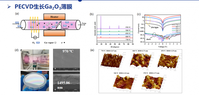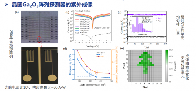 報告分享了薄膜CVD生長以及陣列探測器與應(yīng)用的研究進(jìn)展與成果。詳細(xì)介紹了氧化鎵晶體薄膜MOCVD生長/襯底制備,LSPR增強(qiáng)Pt/Ga2O3復(fù)合薄膜光響應(yīng),PECVD生長Ga2O3薄膜,Mist-CVD 生長α相Ga2O3薄膜,Ga2O3基日盲紫外探測陣列器件(4×4),16單元Ga2O3矩形陣列,晶圓Ga2O3陣列探測器的紫外成像,晶圓Ga2O3陣列探測器的紫外通訊,自供電Ga2O3基肖特基光電二極管陣列等研究內(nèi)容。