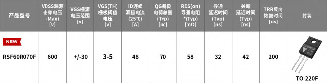 常規(guī)產(chǎn)品封裝為TO-247,而RSF60R070F為TO-220F封裝,做到大電流小封裝;