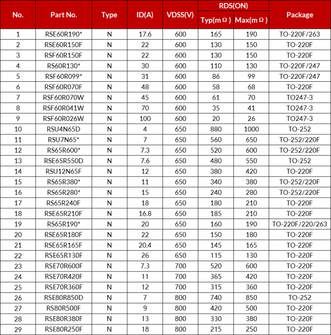 瑞森半導體進一步壯大和完善超結(jié)(SJ)MOSFET系列,推出600V超結(jié)功率MOSFET---RSF60R070F、RSF60R026W型號。2枚新品各自具備核心優(yōu)勢,為國內(nèi)少有產(chǎn)品型號 ,技術(shù)領(lǐng)航市場。