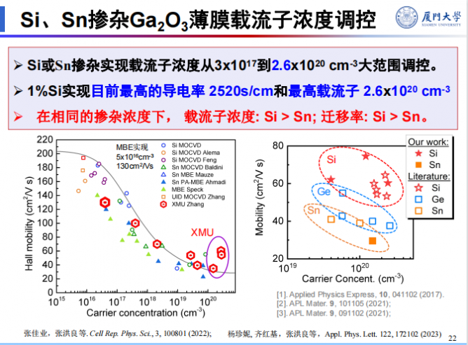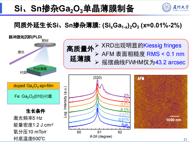 報告介紹了設備與表征技術,以及Si、Sn摻雜氧化鎵電子結構研究成果,研究利用脈沖激光沉積和分子束外延技術分別通過Si和Sn摻雜實現(xiàn)了氧化鎵外延薄膜載流子從3×1017 cm-3到 2.6×1020 cm-3的大范圍調控。其中,1% Si摻雜的Ga2O3薄膜實現(xiàn)了目前文獻報道的最高導電率 2520 S/cm和最高載流子濃度 2.6×1020 cm-3。結合同步輻射硬X射線光電子能譜(HAXPES)和密度泛函理論(DFT)計算,闡明了Si是氧化鎵最優(yōu)選的n型摻雜劑,并提出Si共振摻雜機制的理論模型。明晰缺陷與摻雜機制,極少量雜質/缺陷的抑制策略。