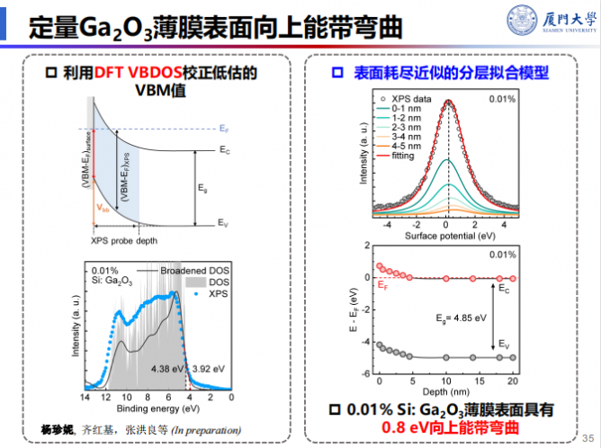 另一方面,課題組也對氧化鎵薄膜的表界面電子結構進行系統(tǒng)研究,發(fā)現(xiàn)氧化鎵表面存在高達0.8 eV的向上能帶彎曲,其內在原因是Ga 4s軌道構成的導帶底部能量較高和氧化鎵較低的功函數(shù)(僅為3.2 eV)。向上的能帶彎曲給Ga2O3歐姆接觸帶來挑戰(zhàn)。Si重摻雜的氧化鎵薄膜能有效緩解肖特基勢壘的形成。