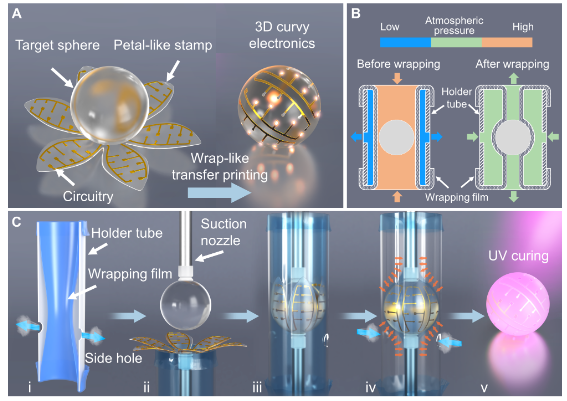 7月27日,該研究成果在《科學(xué)進(jìn)展》(Science Advances)以“用于三維曲面電子器件的包裹式轉(zhuǎn)印方法”(Wrap-like transfer printing for three-dimensional curvy electronics)為題發(fā)表。