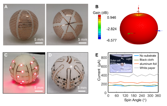 圖2. 利用包裹式轉(zhuǎn)印制備的三維曲面電子器件,(A)球形天線,(B)球形天線方向圖,(C)球形LED陣列,(D)球形太陽能電池陣列,(E)球形太陽能電池陣列在不同背景材料下輸出隨角度變化曲線