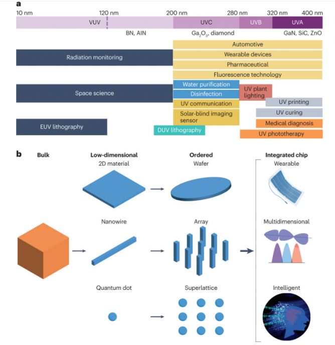 隨著傳感技術(shù)的普及,紫外光探測(cè)器的市場(chǎng)覆蓋了多種消費(fèi)電子和工業(yè)應(yīng)用領(lǐng)域(如下圖a),包括自動(dòng)駕駛、制藥、生物診斷、環(huán)境監(jiān)測(cè)和工業(yè)監(jiān)控等。其中,消費(fèi)電子(智能手機(jī)、平板、手表、筆記本等)在制造過(guò)程中依賴紫外光消毒,因而對(duì)紫外光探測(cè)器的需求巨大。同時(shí),紫外消毒產(chǎn)業(yè)在生物醫(yī)藥領(lǐng)域的需求日益凸顯,特別是新冠疫情期間,需要紫外光探測(cè)器來(lái)檢測(cè)環(huán)境的紫外光水平。另外,在包裝工業(yè)、發(fā)酵工業(yè)、日常生活中,紫外光探測(cè)器都有重要的應(yīng)用。如下圖b所示,通過(guò)不斷減小尺寸,體塊的寬禁帶半導(dǎo)體可以發(fā)展為低維納米材料(二維材料、一維納米線和零維量子點(diǎn)),從而展現(xiàn)出機(jī)械柔性和獨(dú)特的電子結(jié)構(gòu)。這些低維的納米材料可以進(jìn)一步組裝成大面積有序的體材料,包括晶圓級(jí)薄膜、納米線陣列和量子點(diǎn)超晶格。最終,設(shè)計(jì)和優(yōu)化出高性能的紫外光探測(cè)器,制造出可穿戴的、智能的和多功能集成的光芯片,以滿足不斷增長(zhǎng)的紫外光芯片需求。