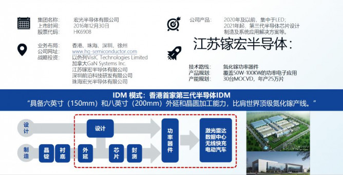 深圳鎵宏半導(dǎo)體及其子公司江蘇鎵宏半導(dǎo)體,引進(jìn)美國(guó)領(lǐng)先公司的核心技術(shù)團(tuán)隊(duì),以團(tuán)隊(duì)在海外積累的大功率氮化鎵芯片規(guī)模化設(shè)計(jì)及生產(chǎn)技術(shù)經(jīng)驗(yàn)為基礎(chǔ),結(jié)合國(guó)內(nèi)市場(chǎng)優(yōu)勢(shì),著手建設(shè)氮化鎵功率芯片 IDM 項(xiàng)目。此外,鎵宏與以色列的 VisIC、加拿大的 Gan System(2023 年 3 月被英飛凌收購(gòu))兩家全球領(lǐng)先的氮化鎵大功率芯片設(shè)計(jì)公司建立起了技術(shù)與業(yè)務(wù)合作伙伴關(guān)系。目前,首條試驗(yàn)線已覆蓋了 6 英寸氮化鎵外延片生產(chǎn)、器件制造和應(yīng)用模組開發(fā)等環(huán)節(jié)。除了自主研發(fā)功率芯片,還提供外延和器件代工業(yè)務(wù)。