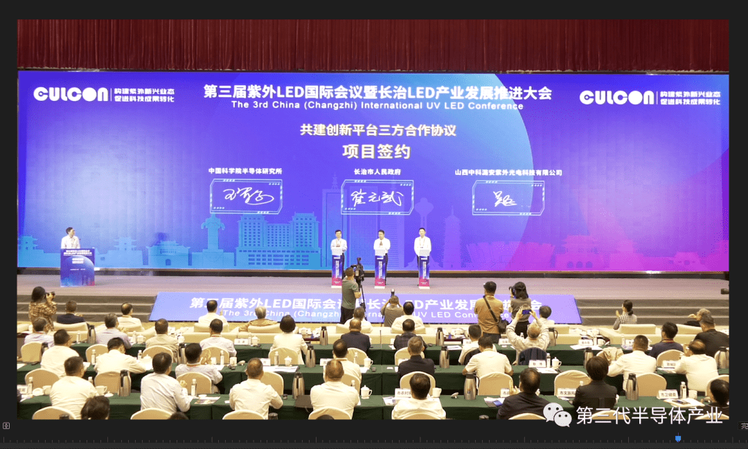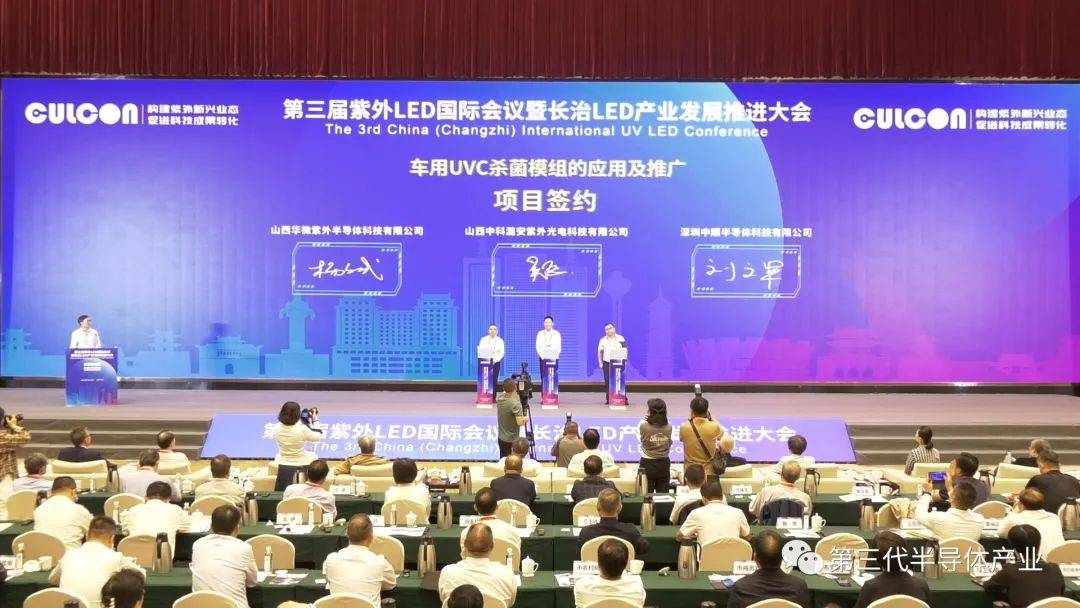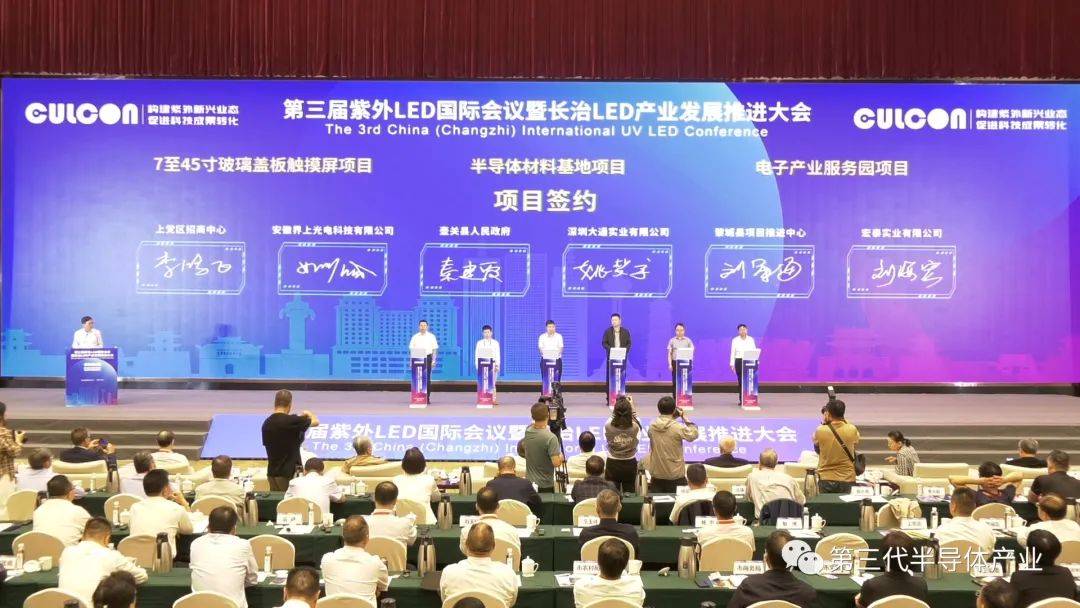 會議期間,長治市人民政府、中國科學院半導體研究所、山西中科潞安紫外光電科技有限公司三方簽訂共建創(chuàng)新平臺合作協(xié)議。另有半導體光醫(yī)療產業(yè)化項目、新一代半導體光催化技術在環(huán)境空氣殺消的應用項目、低功耗深紫外LED顯示芯片及產業(yè)化項目、車用UVC殺菌模組的應用及推廣項目、7至45寸玻璃蓋板觸摸屏項目、半導體材料基地項目、電子產業(yè)服務園項目等7個紫外LED相關產業(yè)項目簽約落地長治。中關村半導體照明工程研發(fā)及產業(yè)聯(lián)盟秘書長阮軍主持了簽約等活動環(huán)節(jié)。