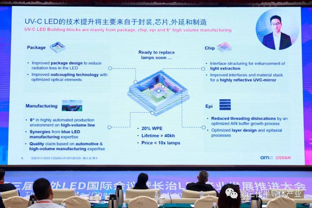 深紫外消殺、植物光照、創(chuàng)新技術等是半導體照明應用的發(fā)展趨勢,艾邁斯歐司朗光電半導體照明事業(yè)部全球應用技術高級總監(jiān)陳文成帶來了“深紫外LED的技術進展和汞燈替代路線圖”的主題報告,分享了當前技術及應用進展,并指出UV-C LED的技術提升將主要來自于封裝、芯片、外延和制造。系統(tǒng)的總擁有成本(TCO)將加速LED對紫外汞燈的替換。