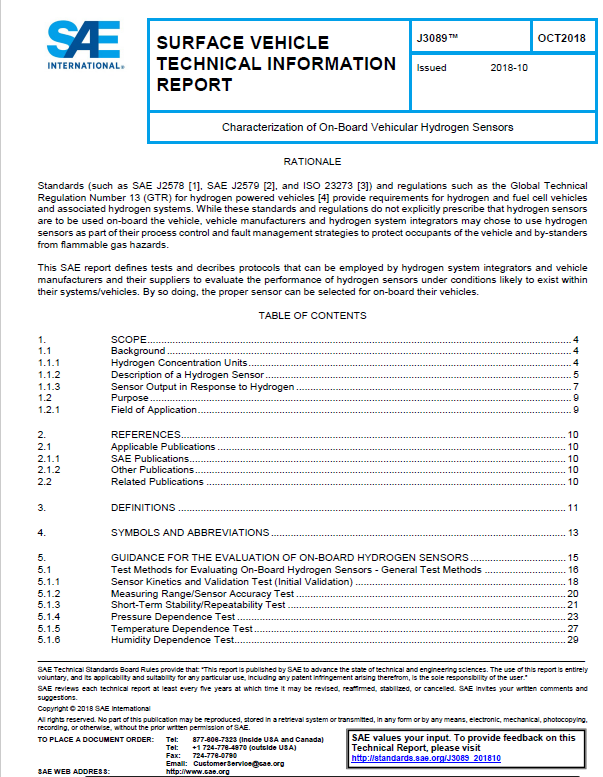 氫能源汽車的出現(xiàn)對氫氣傳感器的性能提出了更高的要求,由于氫能源汽車專用氫氣傳感器使用場景的特殊性(高速移動、顛簸、冗余空間極少等),傳統(tǒng)氫氣傳感器的性能很難達到氫能源汽車行業(yè)領域的安全標準。雖然現(xiàn)在國內(nèi)還沒有統(tǒng)一的標準用來測試和評價,但是早在2018年美國機動車工程師學會(SAE)就已經(jīng)發(fā)布了非常詳盡的車載氫濃度傳感器測試評價方法。