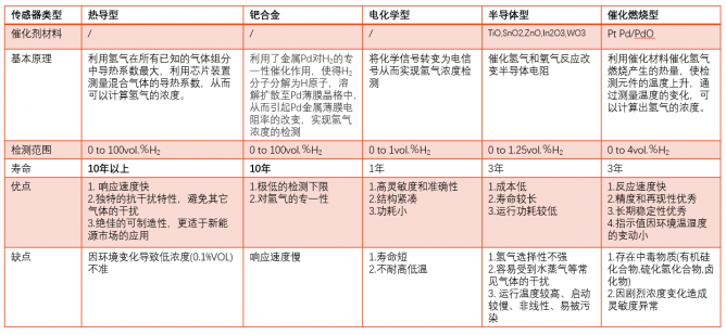 氫氣傳感器根據(jù)不同的物理化學特性,可分為催化燃燒式、電化學式、鈀合金式樣、熱傳導式和半導體式五類原理。下表為各種傳感器的基本原理及優(yōu)缺點對比圖。