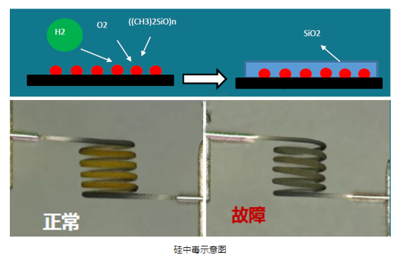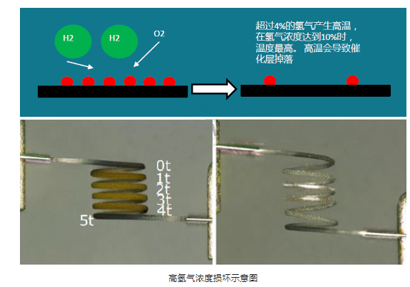 當前很多氫燃料系統(tǒng)集成商使用的氫氣傳感器主要為催化燃燒式,主要原因是日本豐田氫燃料電池車MIRAI率先采用的就是催化燃燒式氫氣傳感器,但隨著時間的推移以及技術的廣泛應用后,該原理的傳感器開始出現(xiàn)很多失效模式,當然這與復雜的車輛環(huán)境存在很大的關系。首先是硅中毒,整車和燃料電池系統(tǒng)里,在部分管路連接上我們一般會選擇硅膠管,同時電堆的密封材料里也可能會有含硅物質(zhì)。這些零組件如果選型不當,在使用過程中可能會釋放硅氧烷類物質(zhì)(Siloxane). 硅氧烷類物質(zhì)會與氫氣、氧氣在檢測元件表面進行反應聚合,產(chǎn)生二氧化硅。二氧化硅會附著在催化劑表面,隔斷氫氣與催化劑的接觸,從而導致整個氫濃度傳感器的性能衰減。其次是高氫氣濃度損壞,氫氣與氧氣在催化劑層上反應會產(chǎn)生熱,以此作為基礎來檢測氫氣濃度。但當傳感器暴露在過高濃度的氫氣中,瞬間產(chǎn)生大量的熱,使元件表面溫度急劇升高,從而會導致催化劑層的剝落,使傳感器失效。所以應盡量減少傳感器暴露在>4%氫氣濃度的氛圍中。