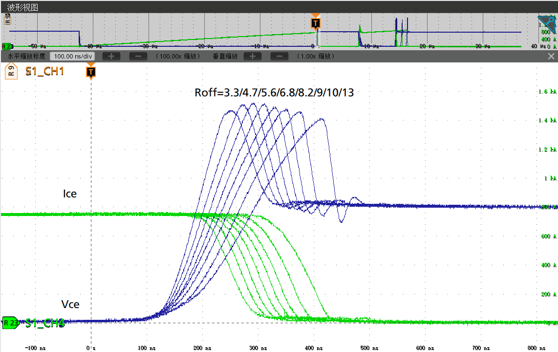 圖2為一款具有Trench結(jié)構(gòu)的IGBT模塊在相同的電壓電流下,不斷增大電阻后得到的波形。可以看到,門級(jí)波形中,其米勒平臺(tái)電壓越來越高,維持時(shí)間越來越長(zhǎng),與無Trench結(jié)構(gòu)IGBT一致;但是在電壓電流波形的中產(chǎn)生了特別的變化,將Vce波形起點(diǎn)對(duì)齊后很明顯其電壓尖峰隨電阻呈現(xiàn)出非單調(diào)性變化,尖峰隨著電阻的增大先上升后下降,最大值出現(xiàn)在5.6Ω。這顯然是在無Trench結(jié)構(gòu)IGBT中極少出現(xiàn)的現(xiàn)象。