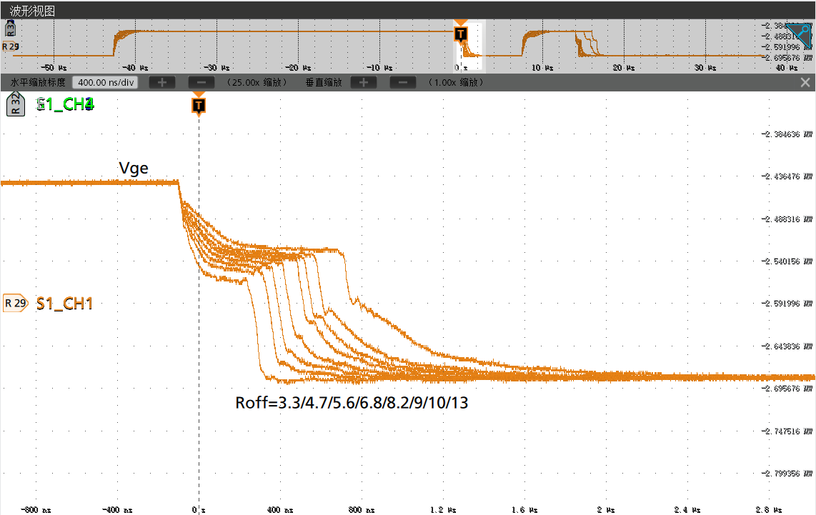 在確定的使用工況下,驅(qū)動(dòng)電路中可調(diào)參數(shù)一般都只剩門級(jí)電容與門級(jí)電阻,其中門級(jí)電容對(duì)于器件關(guān)斷過程影響較小,想要一個(gè)較好的效果往往需要選取上百nF的電容,極大的門級(jí)電容會(huì)給驅(qū)動(dòng)電路的驅(qū)動(dòng)能力與隔離設(shè)計(jì)帶來較大的挑戰(zhàn),甚至?xí)鞮C震蕩問題,所以門級(jí)電容調(diào)整范圍一般較小,普遍通過門級(jí)電阻來調(diào)整電壓尖峰。