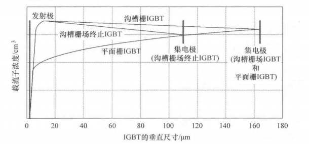 可以看到,Trench結(jié)構(gòu)最大的特點(diǎn)就是柵極進(jìn)行了向下延申,原有的平面柵在導(dǎo)通過程中的反型溝道僅僅存在于P區(qū)中靠近柵極下方的水平面,而溝槽柵在導(dǎo)通過程中反型溝道存在于P區(qū)中與柵極靠近的整個(gè)垂直區(qū)域。這使得Trench結(jié)構(gòu)IGBT導(dǎo)通過程中電子和空穴構(gòu)成的載流子濃度顯著大于平面柵結(jié)構(gòu)。同時(shí)Trench結(jié)構(gòu)可以消除平面柵存在的高阻JFET區(qū),降低了導(dǎo)通壓降。并且有研究表明,硅基IGBT的通態(tài)飽和壓降存在理論上的最小值,要實(shí)現(xiàn)該最小值且不顯著影響器件的關(guān)斷損耗,N-基區(qū)中的通態(tài)存儲(chǔ)載流子濃度分布需呈現(xiàn)出由發(fā)射極側(cè)向集電極側(cè)逐漸遞減的特征。