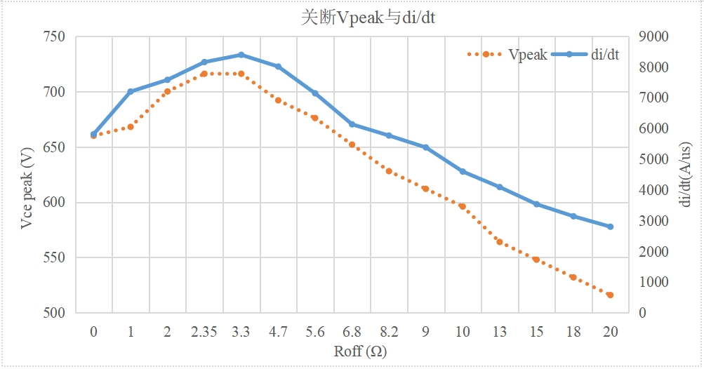 圖7:Trench IGBT在0-20Ω關(guān)斷Vpeak與di/dt