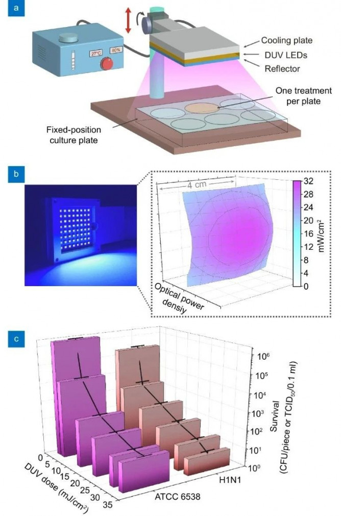 廈門大學(xué)康俊勇教授、尹君副教授課題組根據(jù)致病菌中遺傳物質(zhì)、蛋白質(zhì)的紫外光吸收特性,開發(fā)了一種由275-nm氮化物L(fēng)ED組成的大功率(3.2 W)且輻照均勻的平面光源,能夠在1秒內(nèi)完成對新冠病毒、H1N1流感病毒、金黃色葡萄球菌的有效殺滅(常溫下,≥99.99%)。