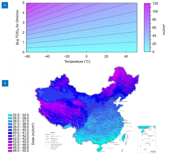圖3 不同溫度下有效殺滅Omicron毒株的紫外輻照劑量預(yù)測模型。 (a)不同殺滅效果所需光劑量;(b) 基于我國1月平均氣溫,預(yù)測露天環(huán)境下3-Log所需的光劑量。