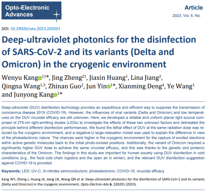 封面文章 | Kang WY, Zheng J, Huang JX, Jiang LN, Wang QN et al. Deep-ultraviolet photonics for the disinfection of SARS-CoV-2 and its variants (Delta and Omicron) in the cryogenic environment. Opto-Electron Adv 6, 220201 (2023).