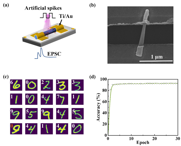 在上述納米柱陣列研究的基礎(chǔ)上,該團(tuán)隊(duì)提取了單根GaN納米柱,實(shí)現(xiàn)了人工突觸器件的制備,并與器件電導(dǎo)性能相結(jié)合,構(gòu)建了神經(jīng)網(wǎng)絡(luò)以模擬對(duì)數(shù)字圖像的識(shí)別【識(shí)別準(zhǔn)確率可在30個(gè)訓(xùn)練周期后達(dá) 93%(圖2)】。由于單根GaN納米柱的體積極小,單次脈沖能耗可低至 2.72×10-12 J,這有助于研發(fā)低功耗的神經(jīng)網(wǎng)絡(luò)計(jì)算系統(tǒng)。相關(guān)成果以Light-stimulated low-power artificial synapse based on a single GaN nanowire for neuromorphic computing為題,發(fā)表在《光子學(xué)研究》(Photonics Research)上。
