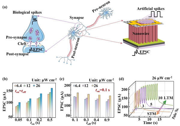 GaN基納米柱具有表面體積比大、穩(wěn)定性高和能帶連續(xù)可調(diào)等優(yōu)勢(shì),但能否作為理想材料制備人工突觸器件以用于低功耗地模擬生物突觸特性,這是值得研究的問(wèn)題。近日,中國(guó)科學(xué)院蘇州納米技術(shù)與納米仿生研究所陸書(shū)龍團(tuán)隊(duì)在前期納米柱相關(guān)工作的基礎(chǔ)上,研發(fā)了基于GaN基納米柱/石墨烯異質(zhì)結(jié)的人工突觸器件。實(shí)驗(yàn)證明,在光刺激下該器件能夠有效模擬神經(jīng)突觸特性,包括記憶特性、動(dòng)態(tài)的“學(xué)習(xí)-遺忘”特性和光強(qiáng)依賴(lài)特性,可實(shí)現(xiàn)從短期記憶(STM)到長(zhǎng)期記憶特性(LTM)的轉(zhuǎn)變(圖1)。相關(guān)成果以Realize low-power artificial photonic synapse based on (Al,Ga)N nanowire/graphene heterojunction for neuromorphic computing為題,發(fā)表在《應(yīng)用物理快報(bào)-光子學(xué)》(APL Photonics)上。